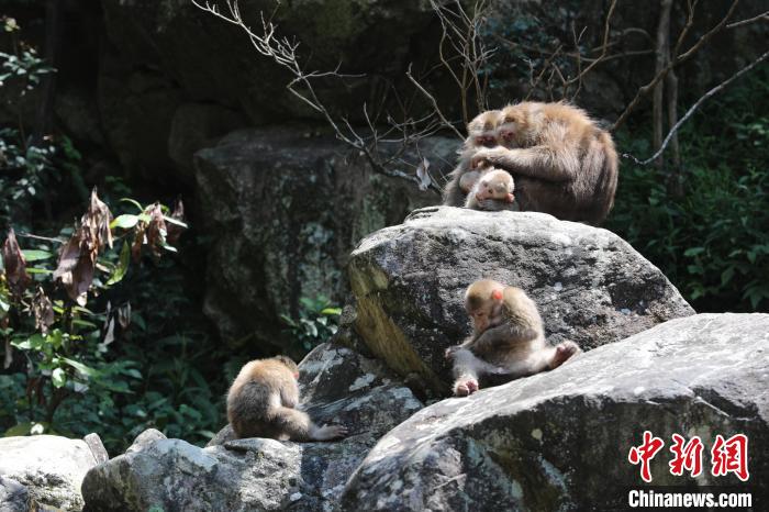 當天,在黃山市浮溪短尾猴野外研究觀測基地內,成群結隊的黃山短尾猴或在小河溝、小溪邊翻石扒枯枝爛葉尋找食物,又或依偎在石壁上曬太陽,還有的在松石和護欄間嬉戲,賣萌調皮的樣子讓人難以忘懷。