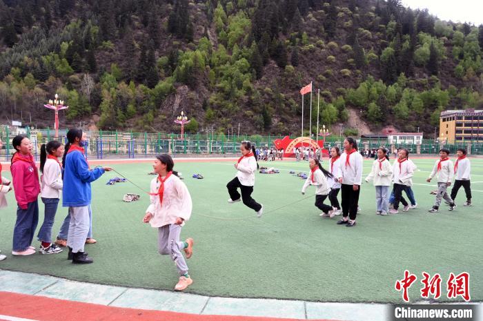 5月17日,四川阿壩州壤塘縣寄宿制學(xué)校的學(xué)生在操場跳繩。 中新社記者 安源 攝