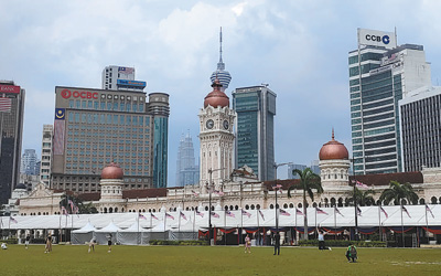 馬來西亞吉隆坡獨立廣場上,人們駐足拍照。