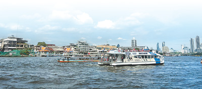 在泰國曼谷,游客乘船欣賞湄南河沿岸風(fēng)景。