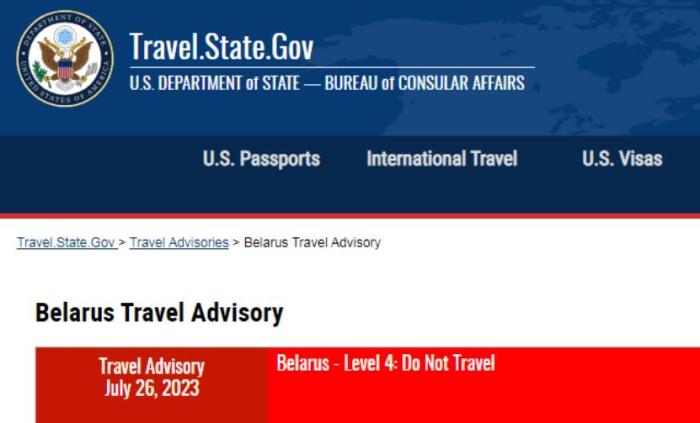 目前,美國務院對赴白俄羅斯的旅行建議為最高級別4級,即 “請勿前往”。