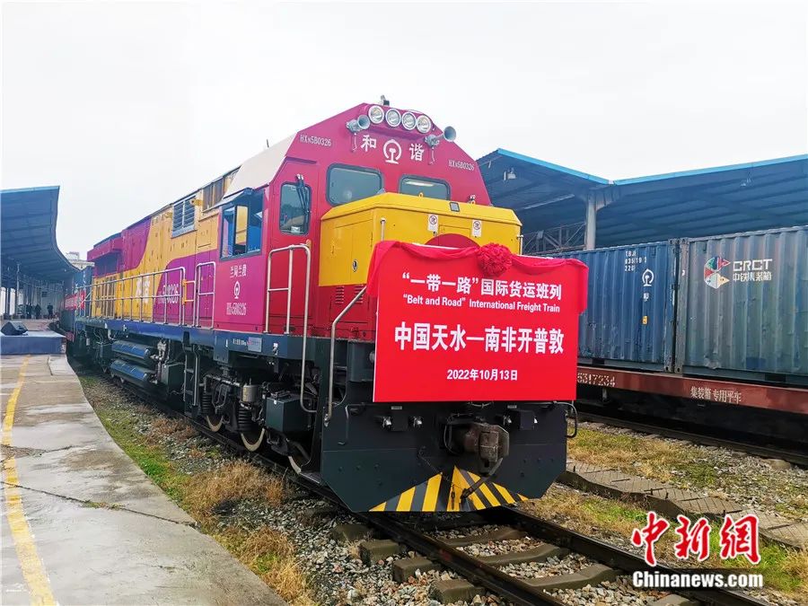 2022年10月13日,“中國天水—南非開普敦”國際班列順利發(fā)運(yùn)。這是首趟甘肅發(fā)運(yùn)的中國至非洲農(nóng)產(chǎn)品專列。李志杰 攝