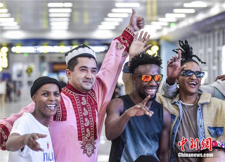 2023年7月23日,參加第六屆中國新疆國際民族舞蹈節(jié)的南非埃爾維斯舞蹈藝術(shù)團(tuán)乘機(jī)抵達(dá)烏魯木齊,主辦方用新疆歌舞迎接遠(yuǎn)道而來的客人。劉新 攝