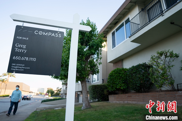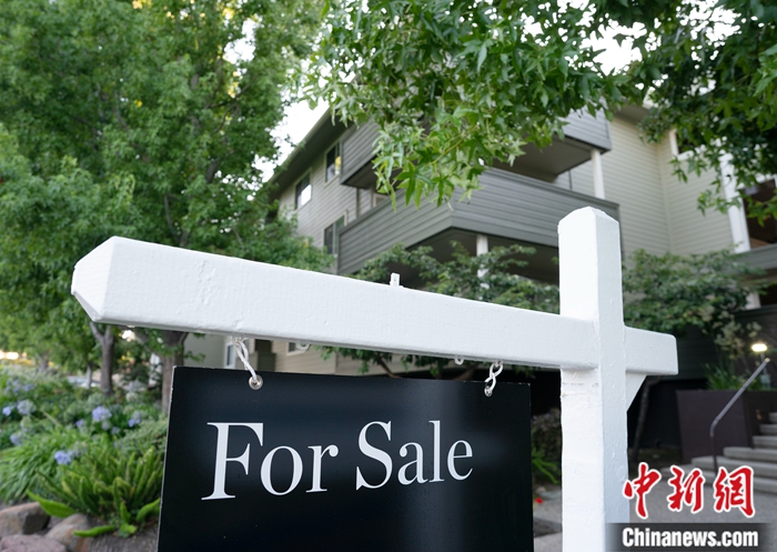 當?shù)貢r間8月22日,美國加州圣馬特奧縣一處公寓前掛出售房廣告。中新社記者 劉關關 攝