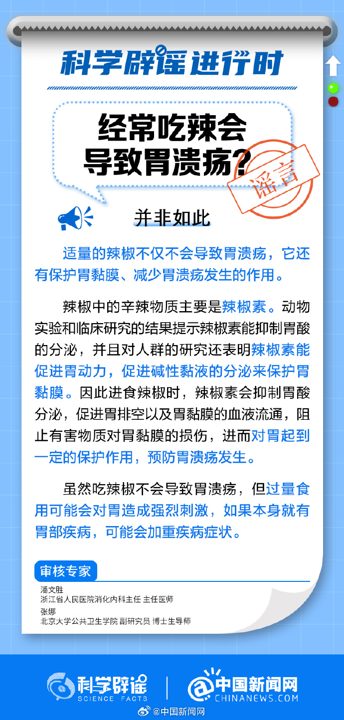 中新網8月23日電 適量的辣椒不僅不會導致胃潰瘍,它還有保護胃黏膜、減少胃潰瘍發(fā)生的作用。辣椒中的辣椒素會抑制胃酸分泌,促進胃排空以及胃黏膜的血液流通,阻止有害物質對胃黏膜的損傷,進而對胃起到一定的保護作用,預防胃潰瘍發(fā)生。但過量食用辣椒可能會對胃造成強烈刺激,如果本身就有胃部疾病,可能會加重疾病癥狀。(來源:@科學辟謠 @中國新聞網 )