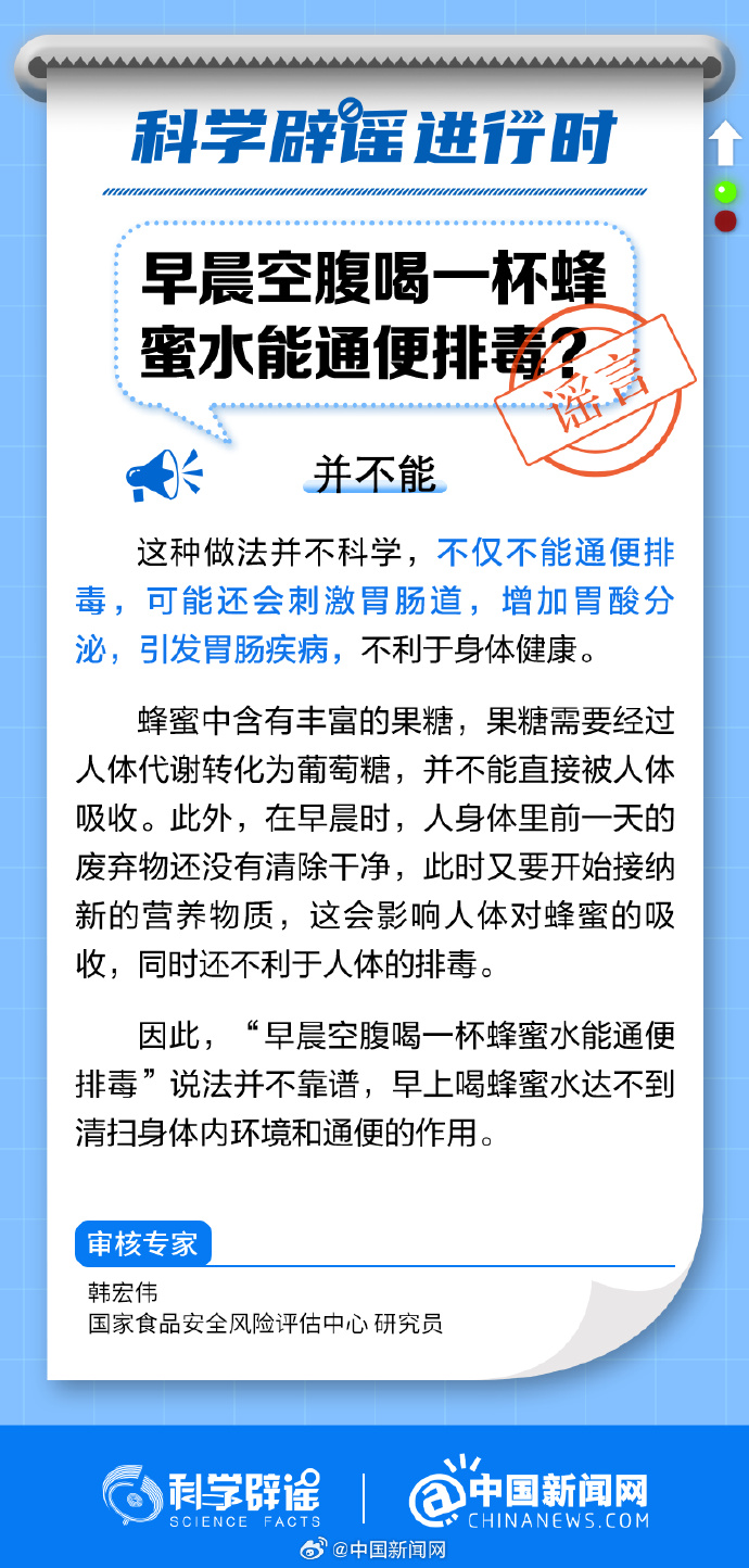 中新網(wǎng)8月22日電 早晨空腹喝蜂蜜水不僅不能通便排毒,可能還會(huì)刺激胃腸道,增加胃酸分泌,引發(fā)胃腸疾病。蜂蜜中含有豐富的果糖,果糖需要經(jīng)過(guò)人體代謝轉(zhuǎn)化為葡萄糖,并不能直接被人體吸收。在早晨,人身體里前一天的廢棄物還沒(méi)有清除干凈,此時(shí)又要開(kāi)始接納新的營(yíng)養(yǎng)物質(zhì),這會(huì)影響人體對(duì)蜂蜜的吸收,還不利于人體的排毒。(來(lái)源:@科學(xué)辟謠 @中國(guó)新聞網(wǎng) )