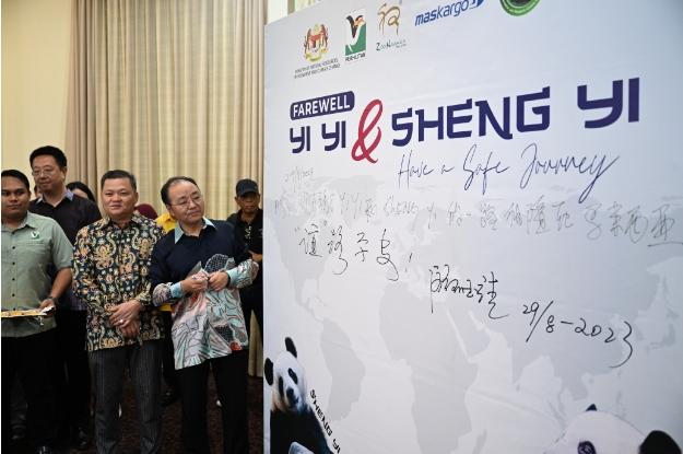 消息稱,歐陽大使在簽名板上留言祝福兩只大熊貓“誼”路平安。范長錫副部長在簽名板上留言感謝“誼誼”“升誼”一路相隨在馬來西亞。