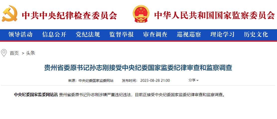 中新網(wǎng)北京8月29日電(記者 袁秀月)又見深夜打虎。中央紀(jì)委國家監(jiān)委網(wǎng)站28日晚通報(bào),貴州省委原書記孫志剛涉嫌嚴(yán)重違紀(jì)違法,目前正接受中央紀(jì)委國家監(jiān)委紀(jì)律審查和監(jiān)察調(diào)查。