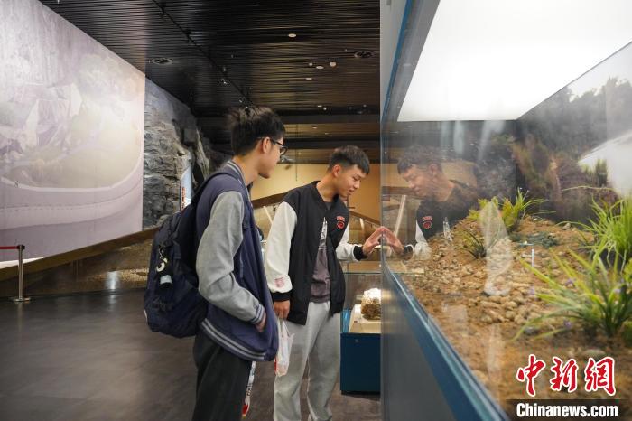 圖為今年5月,游客正在觀賞柳州白蓮洞洞穴科學博物館內(nèi)展出的螺螄殼化石。韋國政 攝