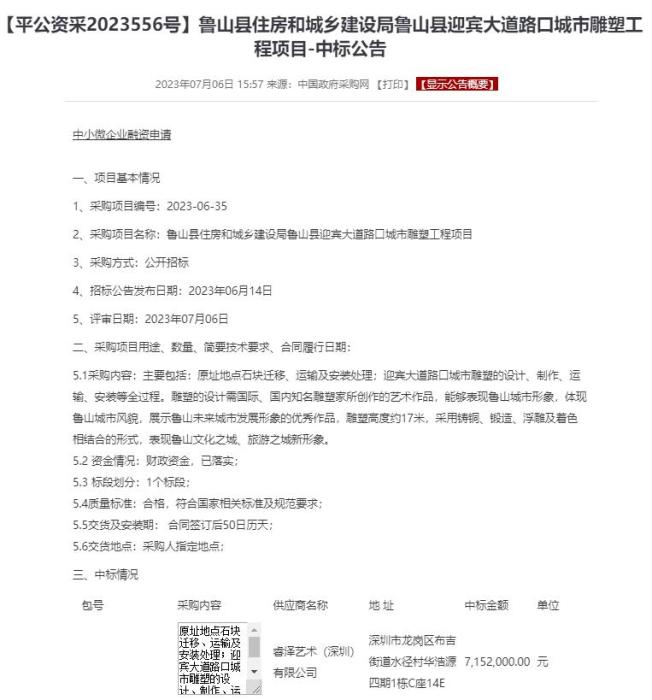 中國(guó)政府采購(gòu)網(wǎng)公開(kāi)的中標(biāo)公告顯示,這座位于魯山縣迎賓大道路口城市雕塑工程項(xiàng)目,中標(biāo)金額達(dá)到715.2萬(wàn)元,資金情況為“財(cái)政資金,已落實(shí)”。