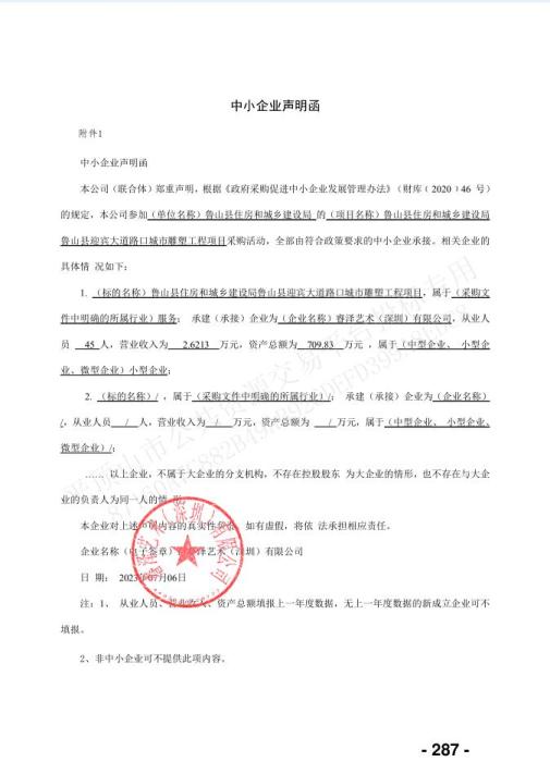 中標(biāo)公告所附的中小企業(yè)聲明函顯示,睿澤藝術(shù)(深圳)有限公司從業(yè)人員45人,營(yíng)業(yè)收入2.6213萬(wàn)元,資產(chǎn)總額為709.83萬(wàn)元。