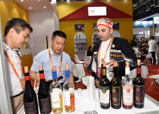 9月4日,參展商在服貿會的格魯吉亞展臺品嘗格魯吉亞葡萄酒。新華社記者 武巍 攝