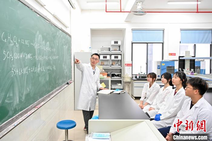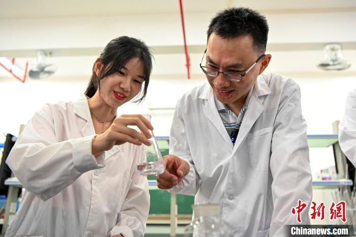 今年6月底,臺灣教師黃崇輔(右)在肇慶學(xué)院指導(dǎo)學(xué)生做實(shí)驗(yàn)。中新社記者 陳驥旻 攝