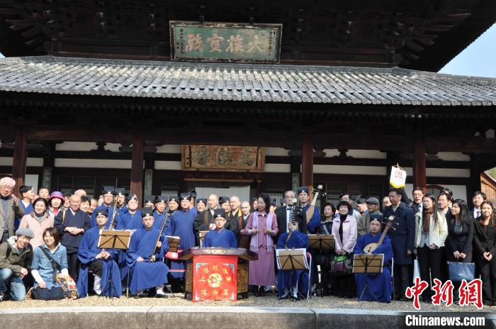 2012年4月8日,上海城隍廟道樂團與日本觀眾在萬福寺大雄寶殿前合影。 (上海市道教協會供圖)