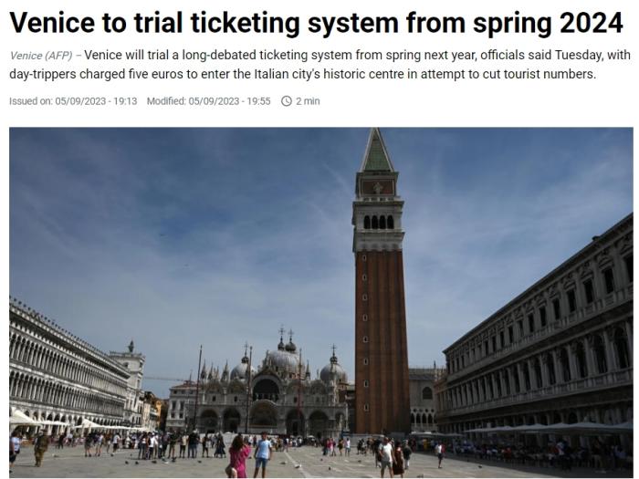 中新網(wǎng)9月6日電 據(jù)法新社報道,當(dāng)?shù)貢r間5日,意大利威尼斯市議會官員表示,威尼斯2024年春起將試行對一日行游客收取5歐元(約合人民幣39.2元)費用。官員表示,此舉意在減少游客人數(shù)。