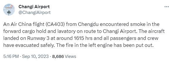 中新網(wǎng)9月10日電 綜合報道,當?shù)貢r間10日,新加坡樟宜機場在社交媒體發(fā)文稱,一架從中國成都起飛的中國國際航空公司航班(CA403)在飛往該機場的途中前貨艙和衛(wèi)生間冒出煙霧。該航班于下午4時15分左右降落在樟宜機場3號跑道。左側(cè)發(fā)動機的火已被撲滅。