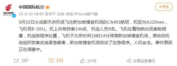 另據(jù)中國國際航空官方微博消息,10日從成都天府機場飛往新加坡樟宜機場的CA403航班在著陸前出現(xiàn)客艙煙霧,機組按程序處置,飛機于北京時間16時14分降落新加坡樟宜機場,落地后機組組織旅客實施緊急撤離,新加坡樟宜機場啟動了應急程序。人機安全。事件原因正在調(diào)查中。