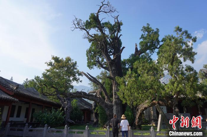 8月7日,河南登封,游客參觀嵩陽書院內(nèi)4500年樹齡的古柏。 中新社記者 韓章云 攝