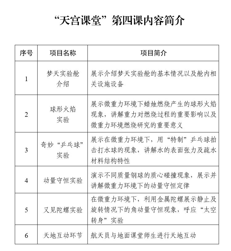 本次太空授課活動(dòng)繼續(xù)采取天地互動(dòng)方式進(jìn)行。3名航天員將在軌展示介紹中國空間站夢(mèng)天實(shí)驗(yàn)艙工作生活場(chǎng)景,演示球形火焰實(shí)驗(yàn)、奇妙“乒乓球”實(shí)驗(yàn)、動(dòng)量守恒實(shí)驗(yàn)以及又見陀螺實(shí)驗(yàn),并與地面課堂進(jìn)行互動(dòng)交流。