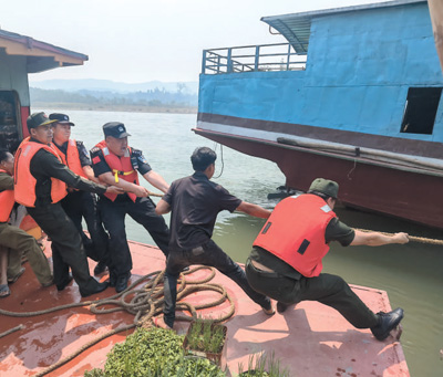中老執(zhí)法人員在湄公河上對商船開展聯(lián)合檢查。