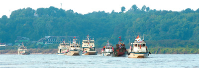 瀾滄江—湄公河從中國關(guān)累到泰國清盛一段航運最為繁忙,大量物資在中老緬泰四國間運輸往來。裝滿貨物的各國商船在水面上來回穿梭,一片繁忙;兩岸村莊升起裊裊炊煙,一片祥和。長期在湄公河上跑船的一名船長說:“有聯(lián)合巡邏執(zhí)法編隊在,我們跑船很放心。感謝四國聯(lián)合巡邏執(zhí)法為湄公河帶來了安寧!”