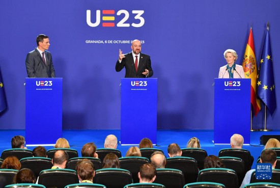10月6日,在西班牙南部城市格拉納達(dá),西班牙代理首相桑切斯(后左)、歐洲理事會主席米歇爾(后中)、歐盟委員會主席馮德萊恩(后右)在歐盟領(lǐng)導(dǎo)人非正式會議后出席新聞發(fā)布會。新華社記者連漪攝
