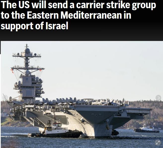 據(jù)美聯(lián)社報道,當(dāng)天,美國國防部長奧斯汀發(fā)表聲明稱,他下令“杰拉爾德·R·福特”號航空母艦戰(zhàn)斗群移至更靠近以色列的東地中海,包括一艘航空母艦、一艘導(dǎo)彈巡洋艦和四艘導(dǎo)彈驅(qū)逐艦,以展示武力,準(zhǔn)備應(yīng)對任何情況,這些情況包括阻止更多武器送達(dá)巴勒斯坦伊斯蘭抵抗運(yùn)動(哈馬斯)以及進(jìn)行監(jiān)視。