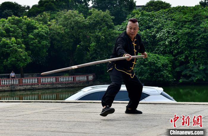 9月20日,福建省漳州市龍文區(qū)檀林耀德堂武術(shù)館學(xué)員陳開木表演宋江長槌棍術(shù)?!≈行律缬浾?張斌 攝