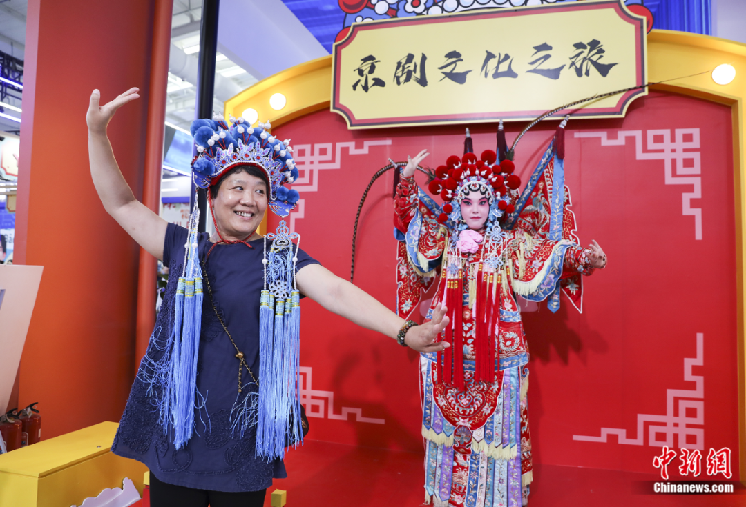 2023年中國(guó)國(guó)際服務(wù)貿(mào)易交易會(huì)(服貿(mào)會(huì))在北京舉行,觀眾在首鋼園區(qū)“京劇文化之旅”展臺(tái)模仿京劇演員表演《穆桂英》片段。趙雋 攝