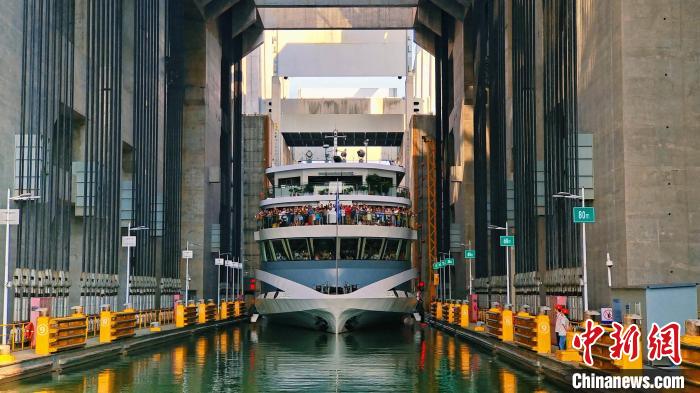 船舶乘坐三峽升船機翻越三峽大壩。三峽通航管理局供圖