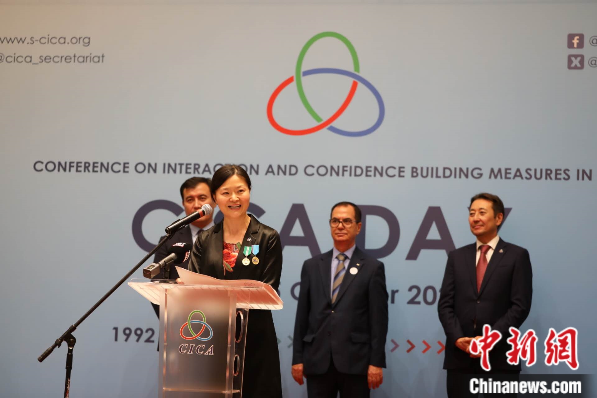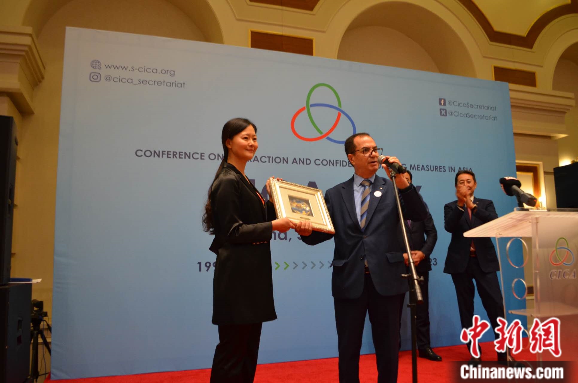 10月5日,哈薩克斯坦阿斯坦納,亞洲相互協(xié)作與信任措施會議秘書處舉辦成立31周年招待會。圖為亞信會議副秘書長遲方被授予總統(tǒng)頒發(fā)的國家獎?wù)隆喰艜h秘書處供圖
