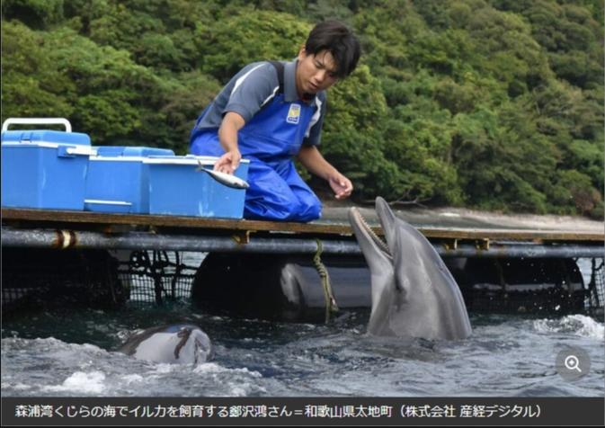 在“森浦灣鯨之?!憋曫B(yǎng)海豚的鄭澤鴻。圖片來(lái)源于《產(chǎn)經(jīng)新聞》報(bào)道截圖。