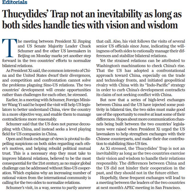 開誠布公地交換意見是消除彼此猜疑、重建政治互信的關(guān)鍵,是雙方為穩(wěn)定和改善雙邊關(guān)系而必須邁出的必要一步。中美關(guān)系是21世紀(jì)最具影響力的雙邊關(guān)系,沒有中美合作,就不可能應(yīng)對任何重大的全球性挑戰(zhàn)。這也是為什么國際社會越來越多的理性聲音呼吁雙方實現(xiàn)關(guān)系正?;?。舒默的訪問在某種程度上似乎部分回應(yīng)了這一呼聲。繼 6 月以來多位美國高官訪華之后,美國兩黨議員代表團來訪,表明了雙方理性處理分歧、穩(wěn)定雙邊關(guān)系的意愿。