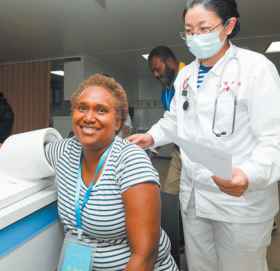8月21日,中國(guó)海軍“和平方舟”號(hào)醫(yī)院船首次對(duì)所羅門群島進(jìn)行訪問。圖為前來就診的當(dāng)?shù)孛癖娫卺t(yī)院船上進(jìn)行血壓檢測(cè)。