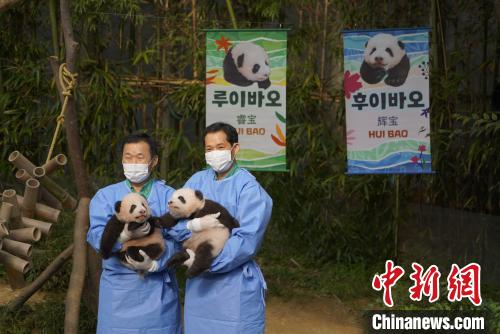 旅韓大熊貓“愛寶”“樂寶”的雙胞胎雌性幼崽即將出生滿百日。12日上午,位于韓國京畿道龍仁市的愛寶樂園熊貓館舉行雙胞胎幼崽首次公眾見面會(huì),并公布了它們的名字為“睿寶”和“輝寶”。