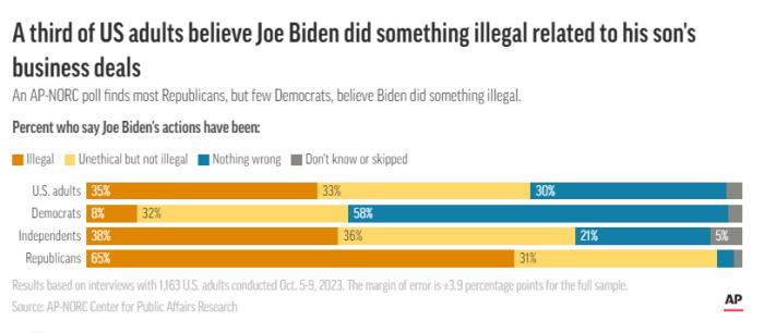 據(jù)美聯(lián)社報道,NORC公共事務(wù)研究中心的最新民調(diào)顯示,68%的受訪者認為拜登與其子亨特·拜登處理海外商業(yè)交易的方式不道德或非法,其中33%的人認為不道德,35%的人認為非法。