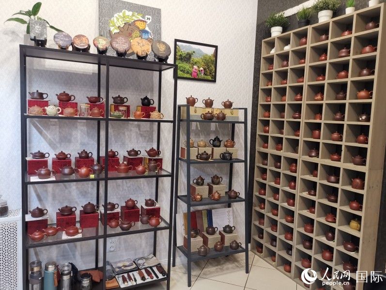 馬克西姆的茶葉店擺放著來(lái)自中國(guó)宜興、景德鎮(zhèn)等地方的茶壺。 人民網(wǎng)記者 楊倩攝