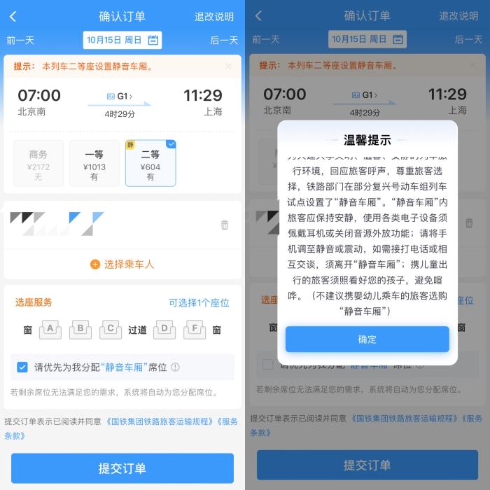 鐵路12306APP購(gòu)票頁(yè)面上的“靜音車廂”提示