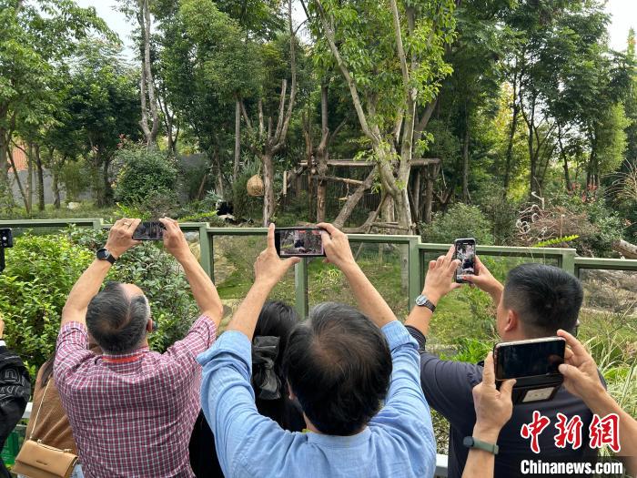 當日,第六屆臺胞社團論壇四川分線路考察暨首屆“情融兩岸·品悟天府”臺胞社團領袖四川行活動走進熊貓基地。金秋的熊貓基地陽光燦爛,大熊貓在圈舍中或坐或臥,也有的抱著竹子大快朵頤,追逐嬉戲,十分可愛。