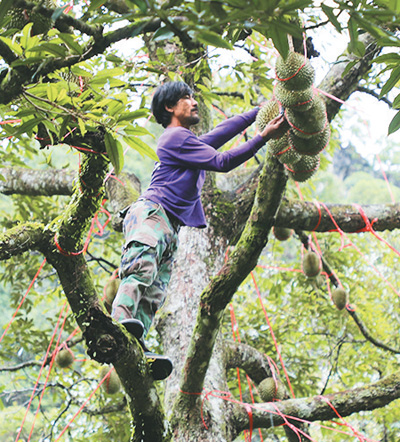 泰國春蓬府薩威縣,果農(nóng)采摘榴蓮。