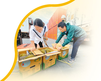 核查貨證、抽樣開箱、剖果檢查……黃中磊和同事劉奇開始按流程查驗(yàn)?!皺z查病媒及有害生物,未見異常;檢查包裝,未見異常;核對品名,未見異常;檢查標(biāo)簽標(biāo)識,未見異?!苯?jīng)過認(rèn)真查驗(yàn),兩人確認(rèn)這批榴蓮查驗(yàn)合格,可以出證放行。