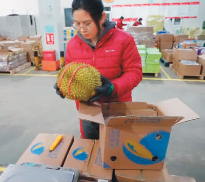 在云南陸航物流服務(wù)有限公司貨場,工作人員查看榴蓮狀態(tài)。