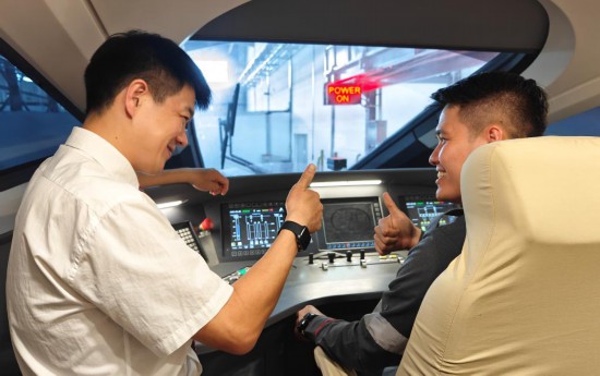 8月25日,在印度尼西亞萬隆的雅萬高鐵德卡魯爾動(dòng)車所內(nèi),中國師傅穆振(左)在向印尼火車司機(jī)塞蒂亞萬講解動(dòng)車組出庫前的上電作業(yè)。