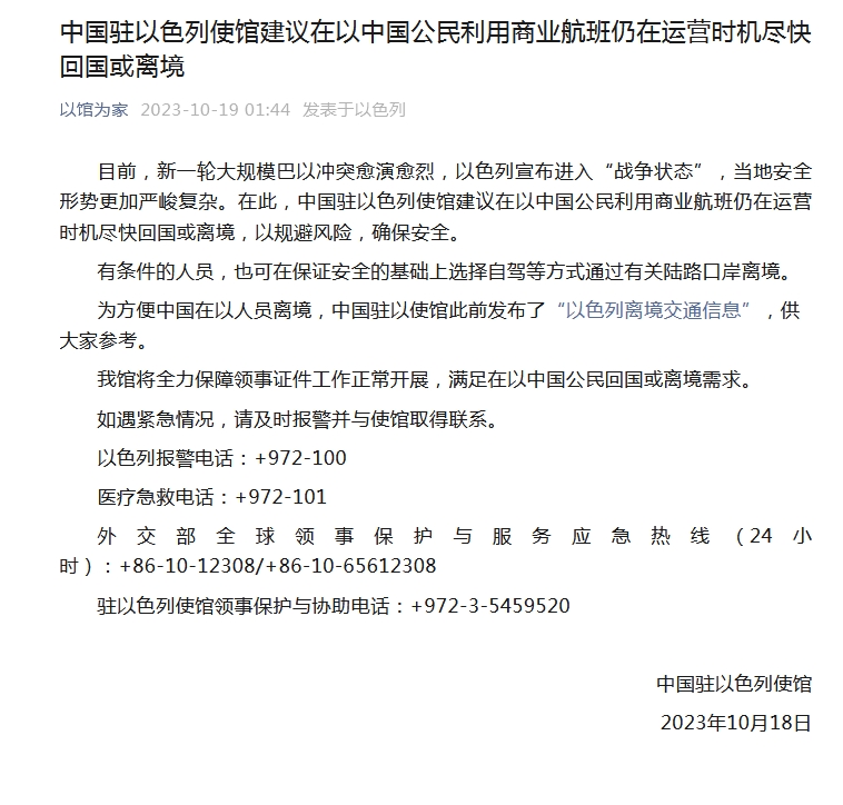中新網(wǎng)10月19日電 據(jù)中國駐以色列使館官方微信消息,目前,新一輪大規(guī)模巴以沖突愈演愈烈,以色列宣布進入“戰(zhàn)爭狀態(tài)”,當(dāng)?shù)匕踩蝿莞訃谰?fù)雜。在此,中國駐以色列使館建議在以中國公民利用商業(yè)航班仍在運營時機盡快回國或離境,以規(guī)避風(fēng)險,確保安全。