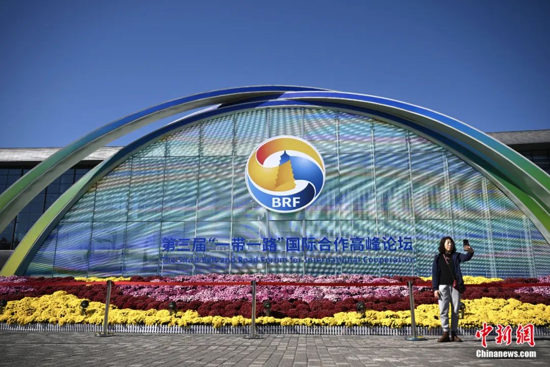 2023年10月14日,市民在北京市一處第三屆“一帶一路”國際合作高峰論壇元素裝置前拍照。第三屆“一帶一路”國際合作高峰論壇將于10月17日至18日在北京舉行。趙文宇 攝