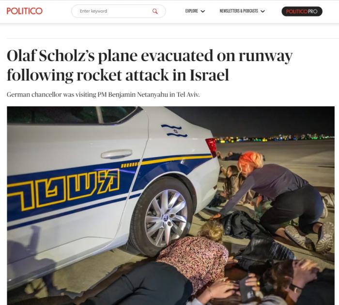 德國(guó)總理在以色列機(jī)場(chǎng)遇火箭彈襲擊 緊急撤離至避難所