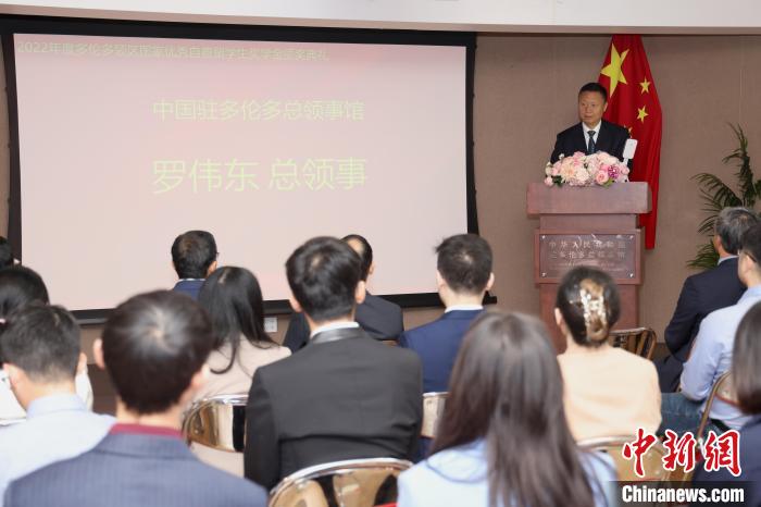 中國駐多倫多總領館10月21日為領區(qū)2022年度“國家優(yōu)秀自費留學生獎學金”獲得者頒獎。圖為中國駐多倫多總領事羅偉東在儀式上致辭。中新社記者 余瑞冬 攝