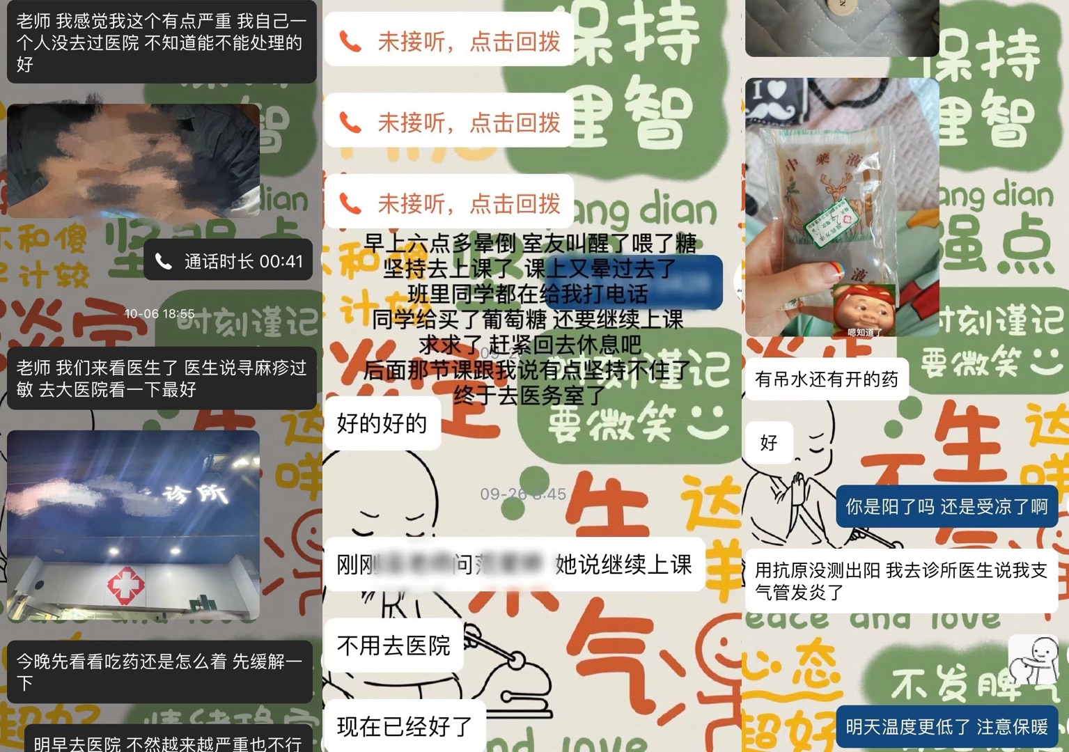 “因為我?guī)У膶W生基數(shù)較大,三百多人,每周基本上都會有十幾個因生病請假的學生?!?阿宛向中新網(wǎng)介紹,生病的學生中,最常見的是感冒發(fā)燒、胃疼等情況,也有一些突發(fā)狀況,比如“著急下樓收衣服結果被垃圾車刮到,半夜嘔吐到進醫(yī)院,低血糖在課上暈倒”等。