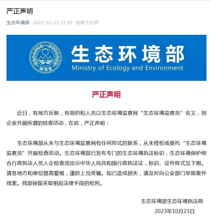中新網(wǎng)10月23日電 據(jù)生態(tài)環(huán)境部公眾號10月23日消息,近日,有地方反映,有組織和人員以生態(tài)環(huán)境監(jiān)察網(wǎng)“生態(tài)環(huán)境監(jiān)察員”名義,到企業(yè)開展所謂的檢查活動,在此,生態(tài)環(huán)境部嚴正聲明: