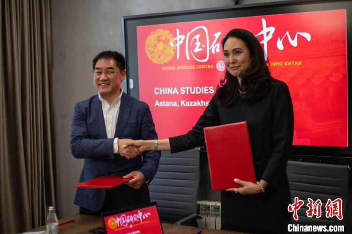 當(dāng)?shù)貢r間24日,哈薩克斯坦阿斯塔納,哈薩克斯坦中國研究中心主任古麗娜爾與上海交通大學(xué)醫(yī)學(xué)院院長辦公室副主任童天朗簽署合作備忘錄。 主辦方供圖